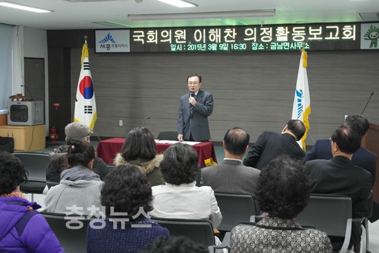 이해찬 의원(새정치민주연합, 세종특별자치시)은 9일과 10일 세종시 연기면, 금남면, 연동면, 부강면에서 시민 500여명이 참석한 가운데 7선 도전을 위한 의정보고회를 개최했다.