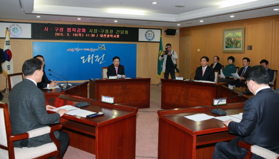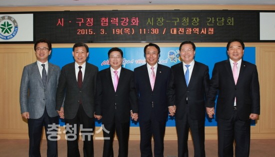권선택 대전시장과 한현택(동구), 박용갑(중구), 장종태(서구), 허태정(유성구), 박수범(대덕구) 구청장은 19일 오전 시청 중회의실에서 간담회를 갖고, 시정과 구정이 흔들림 없도록 상호 협력을 강화하기로 했다.