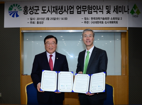 홍성군은 도시재생사업의 성공적 추진 여건 마련을 위해 25일 오후 2시 한국과학기술회관 회의실에서 (사)대한국토·도시계획학회와 공동으로 ‘홍성군 도시재생사업 업무협약식 및 세미나’를 개최했다.