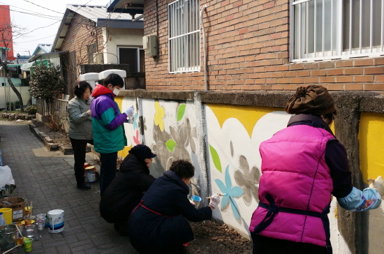 강좌 수강생들은 어려운 어르신들이 많이 거주하는 점을 감안하여 동심을 느껴 볼 수 있도록 화사한 꽃으로 담벼락을 가득 채색하여 칙칙했던 골목길을 산뜻한 골목길로 재탄생 시켜 주었다.