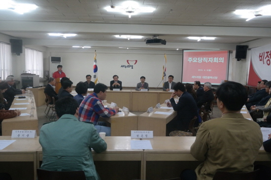 이날 회의는 제20대 총선이 1년여 남은 상황에서, 새누리당의 총선 승리 방안에 대해 당직자들의 의견을 듣기위해 마련됐다.