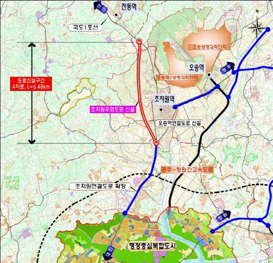 행정중심복합도시건설청(청장 이충재, 이하 행복청)은 행정중심복합도시(이하 행복도시) 광역교통개선대책에 신규 반영된 조치원 우회도로 건설사업이 올 상반기 예비타당성조사 대상사업으로 최종 선정됐다고 11일 밝혔다.