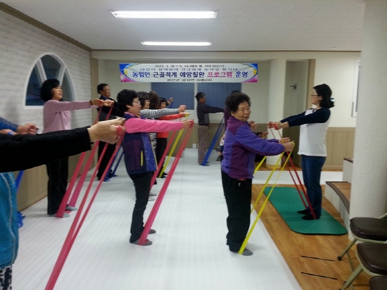 농업인 근골격계 예방질환 프로그램 진행은 농업인의 근력, 유연성 등 운동 능력향상으로 농작업 관련 질환을 예방하고 퇴행성 및 근골격계 질환과 스트레스 해소를 통한 건강증진을 도모하기 위해 실시하는 프로그램으로 한서대 박소연 교수님의 진행으로 이루어지고 있다.