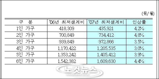 이는 4인가구의 경우 올해 최저생계비 보다 3%를 인상한 금액이며,1인가구는 4.2%, 2인가구는 4.8%를 각각 인상한 금액이다.