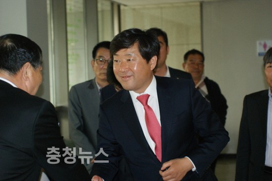 ▲ 황명선 논산시장이 당선유지형을 선고받고 나와 관계자들과 악수를 하고 있다.