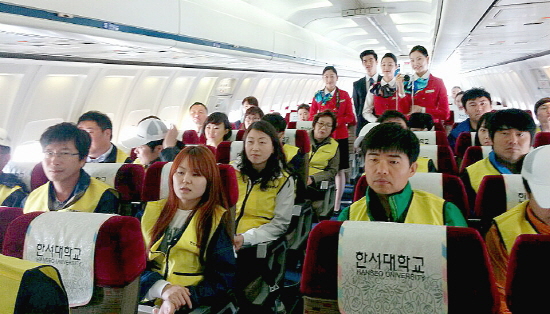 한서대학교의 협조로 진행된 이날 체험교육에서는 △선박사고 대피요령 및 탈출 체험 △모터보트 조정 체험 △B737 비행기 탑승 및 탈출 시험 △지진 가상체험관 △소화기 작동 △건물 탈출 △심폐소생술 실습 등 육·해·공 전 분야에 걸친 실습 교육이 진행됐다.