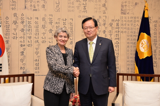 정의화 국회의장은 5.20(수) 오후 1시 30분 의장접견실에서 이리나 보코바(Irina BOKOVA) 유네스코 사무총장을 만나 한‧유네스코 간 협력관계 증진 등에 대해 의견을 나눴다.