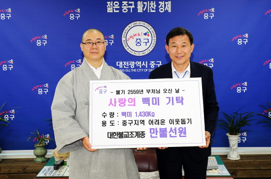 기탁식에서 박용갑 구청장은 “어려운 이웃을 위해 마음을 담아 백미를 기탁해 주셔서 감사드리며, 만불선원 주지 스님과 신도 분들의 따뜻한 정성이 잘 전달되어 더 화목한 중구가 되기를 희망한다”고 말했다.