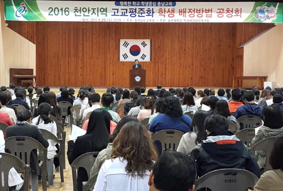 충남도교육청(교육감 김지철)은 천안지역 고교평준화 학생 배정방법 연구에 따른 현장의 의견수렴을 위해 20일 저녁 천안중학교 강당에서 공청회를 개최했다.