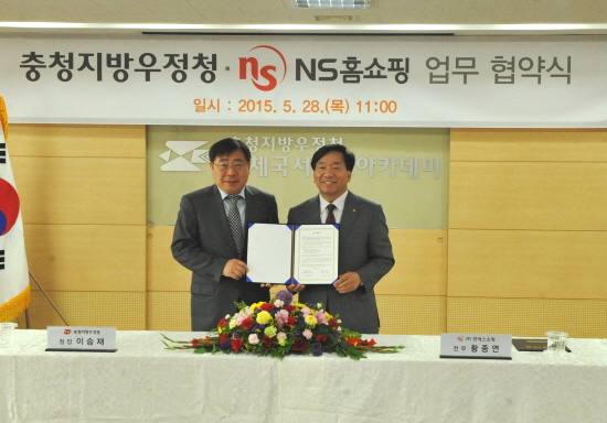 충청지방우정청(청장 이승재)과 NS홈쇼핑(대표이사 도상철)이 28일 업무협약을 체결하고 지방 중소기업 및 온라인 쇼핑 업체 사업활성화를 지원한다. 이승재 청장(왼쪽)과 NS홈쇼핑 황종연 전무가 협약식 후 기념촬영을 하고 있다.