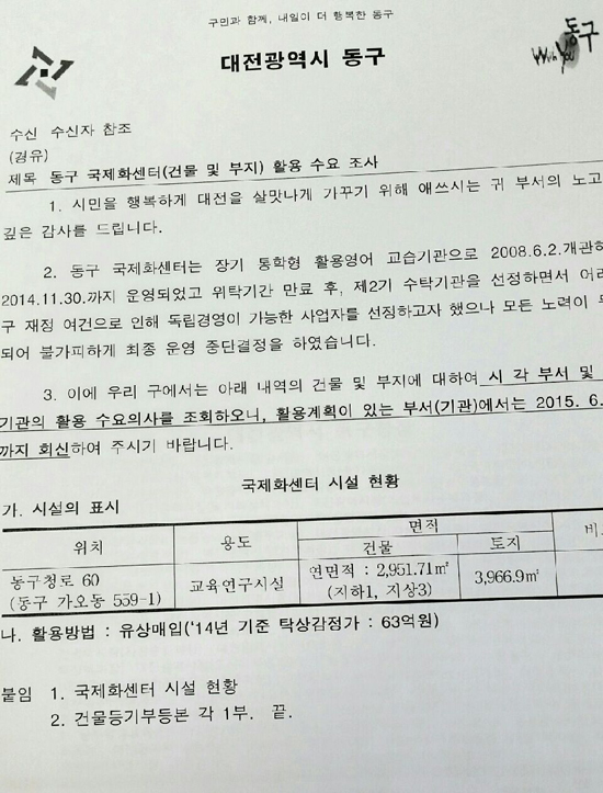 대전 동구가 가오동 국제화센터건물을 대전시를 비롯한 시산하기관에 구입 의사를 묻는 협조 공문을 본지가 단독 입수했다.