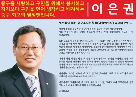 새누리당 중구 조직위원장 공모와 관련해 이은권 前 중구청장이 SNS 글을 올려 화제다.