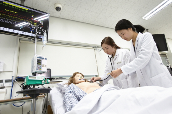 ▲ 한남대 간호학과 학생들의 실습교육을 받고 있다.