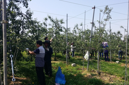 ▲ 군청 공무원들이 사과적과 자원봉사활동을 하고 있다.