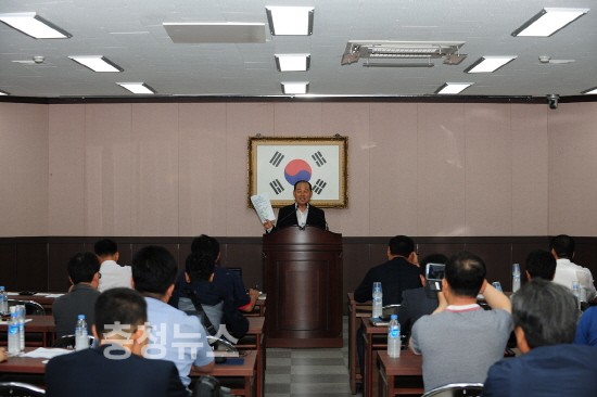 ▲ 25일 제1회의실에서 열린 기자 간담회에서 황선봉 예산군수가 취임 1주년 군정 브리핑을 하고 있다.