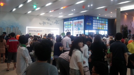 지난 3일(금) 모델하우스를 오픈 한 ‘금강 로하스엘크루’에는무더위에도 불구 많은 인파가 몰리며 문전성시를 이루었다. 오픈 첫날에만 약 3,000명의 방문객이 다녀갔으며, 주말을 포함한 오픈 3일째인 5일(일)까지 누적 방문객 수가 약 1만2천명에 달했다.
