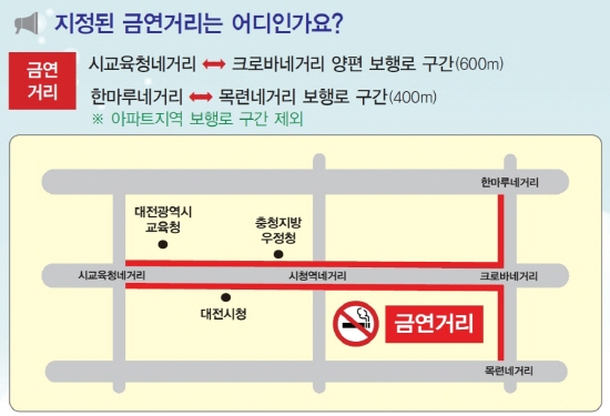 지정된 금연거리는 ▴시교육청 네거리↔크로바네거리 양편 보행로 구간(600m)과 ▴한마루네거리↔목련네거리 보행로 구간(아파트지역 보행로구간 제외/400m) 이다.