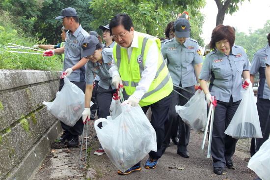 이날은 권선택 대전시장을 비롯해 오수정 대청병원장과 대청병원 의료진, 복수동 주민, 서구청 직원 등 100여 명이 참여해 대청병원 입구에서 서부경찰서, 복수동 주민센터를 도는 1.2㎞ 구간을 대청소했다.