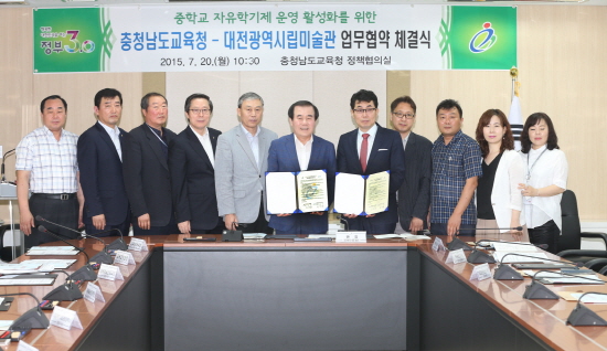 충남도교육청(교육감 김지철)과 20일 오전 10시 30분에 본청 정책협의실에서 대전광역시립미술관(원장 이상봉)과 중학교 자유학기제 운영 및 청소년 예술교육 활성화를 위한 업무협약을 체결했다.