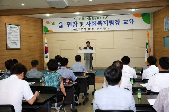이날 교육은 읍면장의 읍면 복지행정에 대한 이해와 복지공동체 형성에 맞는 역할 수행 및 지역복지가 나아갈 방향을 다짐하는 계기를 마련하고자 계획되었으며 보건복지부 지역복지과 전명숙 서기관을 초빙해 진행되었다.