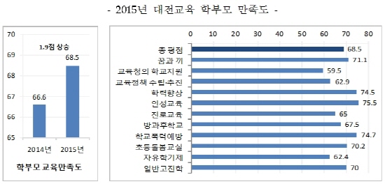 구체적으로 살펴보면 만족도 평균이상 분야는 인성교육 > 학교폭력예방 > 학력향상 > 꿈과 끼 > 초등돌봄교실 > 일반고진학 순으로 인성교육에 대한 만족도(75.5점)가 가장 높았으며, 이는 인성교육의 바탕위에 창의성을 갖춘 인재를 육성한다는 것을 목표로 추진한 친구사랑3운동, 품격있는 대전人 바탕교육, 놀이통합교육 등 인성교육 브랜드화에 박차를 가한 결과로 보인다. 또한 학교폭력 예방(74.7점) 및 학력향상(74.5) 노력도에 대한 만족도도 높게 나왔다.