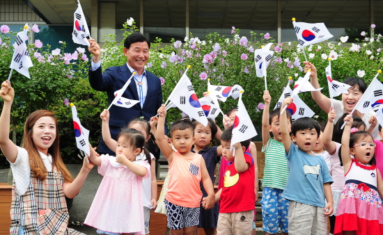 이날 중구청 한가족 어린이집 원생 29명은 손에 손에 태극기를 흔들며 광복의 기쁨을 표현하는 퍼포먼스를 전개했으며, 무궁화 꽃을 앞에 두고 선생님으로부터 나라꽃에 대한 자세한 설명을 듣는 뜻 깊은 시간도 가졌다.