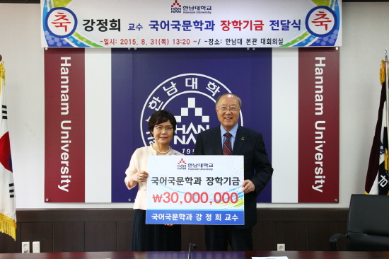 한남대학교는 31일 국문과 강정희 교수와 영문과 홍기영 교수가 이날자로 정년퇴임하며 제자들을 위해 각각 3천만원과 1천만원의 장학기금을 기탁했다고 밝혔다.
