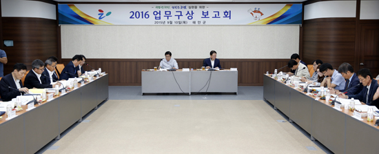 이날 보고회는 내년도 민선6기 3년차를 맞이하는 한 군수의 공약사항 중간점검과 추진동력 확보를 위한 것으로, 각 부서별 소통과 공유 등 협력체계 강화와 이를 통한 군민 삶의 질 향상을 도모하는 데 초점을 맞췄다.