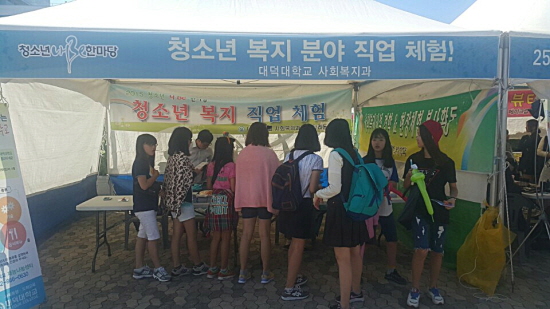 대덕대학교 사회복지과 한울타리(회장 김미희)가 17일부터 이틀 간 국립중앙과학관에서 마당에서 열리고 있는 2015 청소년 나 Be 한마당에 참여, 대전시내 청소년들에게 청소년 복지 분야 전문 직업인 청소년지도사, 청소년상담사, 학교사회복지사, 사회복지사, 평생교육사에 대한 브로쇼어를 만들어 직업 체험토록했다.