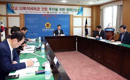 대전시의회 황인호 부의장은 18일 대전시의회 대회의실에서 학교 다목적체육관 건립 추진을 위한 정책간담회를 개최했다.
