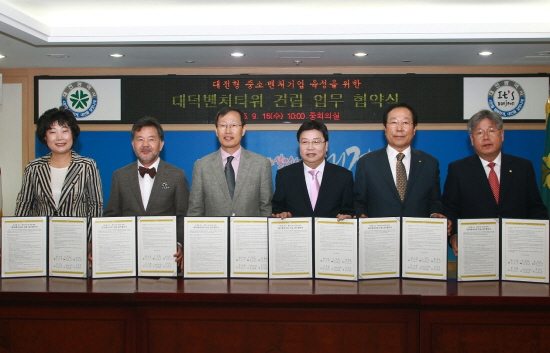 대전시가 지역 벤처기업의 오랜 숙원인 정주여건 확충에 발 벗고 나섰다. 대전시는 최근 시청 중회의실에서 5개 경제단체와 ‘대덕벤처타워’ 건립을 위한 업무협약을 체결했다.