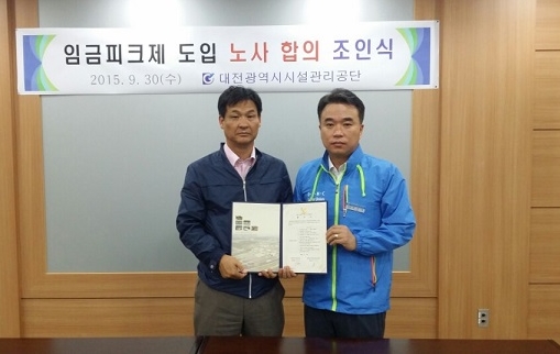 대전도시철도공사, 대전마케팅공사에 이어 대전시 시설관리공단(이사장 김근종)도 30일 오전, 2016년부터 임금피크제를 도입하기로 노·사간에 합의 했다고 밝혔다.