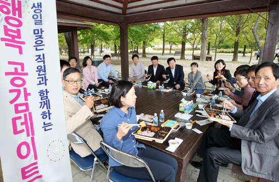 장종태 서구청장이 30일 둔산동 ‘샘머리공원’에서 생일을 맞이한 직원들과 함께 ‘도시락 행복나들이’를 통해 소통의 시간을 보냈다.