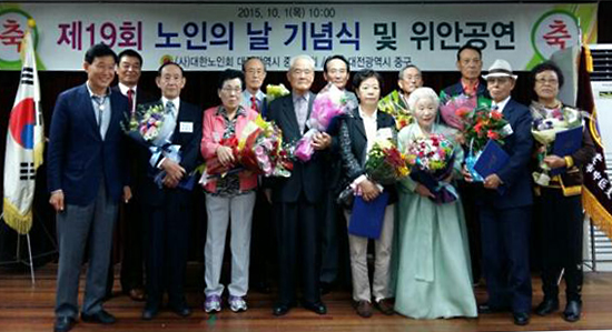 이날 행사에서는 지역사회 발전에 기여한 모범노인 29명과 노인복지 기여자 6명 등 35명이 박용갑 중구청장과 문제광 의장, 송난영 중구지회장으로부터 표창장을 받았다.