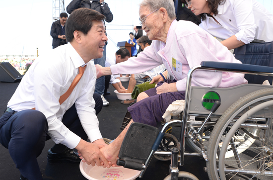 ▲ 제19회 노인의 날 행사에서 황명선 논산시장이 세족식 행사에 참여해 어르신의 발을 닦아드리고 있다.