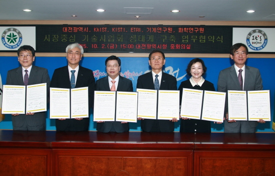 대전시가 ETRI 등 5개 기관 2일 시청 중회의실(10층)에서 ‘시장중심 기술사업화 생태계 구축 업무협약’을 체결하고, 중소기업의 지속 성장을 지원하는 프레임워크 모델을 만들기 위해 상호 협력키로 했다.