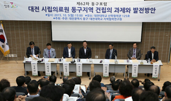 대전 동구(구청장 한현택)가 5일 대전대학교 산학협력관 세미나실에서 동구포럼회원, 주민 등 200여명이 참석한 가운데 ‘대전시립의료원 동구지역 건립의 과제와 발전방안’을 주제로 제62회 동구포럼을 개최했다고 밝혔다.