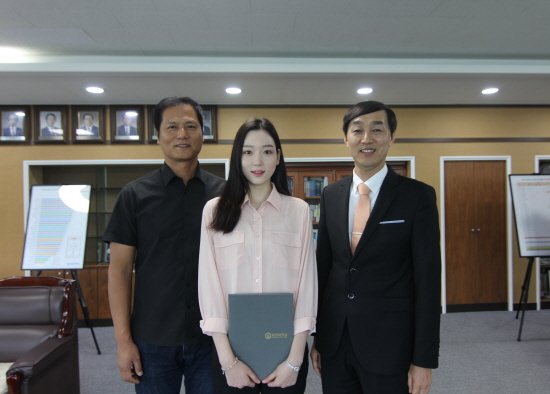 ▲ 가운데 박예린 학생, 왼쪽 임주완 모델과 교수, 오른쪽 이승환 총장직무대리