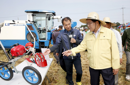한편 한상기 군수는 최근 초고령화 추세에 있는 지역 농촌의 어려움을 극복하기 위한 기술 개발의 필요성을 강조하는 한편, 친환경 생분해필름을 활용한 직파재배 현장을 살펴보고 콤바인으로 기념 추수를 실시하며 농업기술 및 생산력 향상을 위한 군의 의지를 알렸다.
