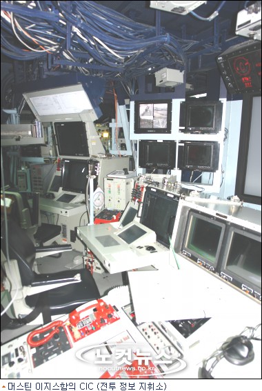 ![]() 6월 22일 샤일로 호도 참가해 하와이 앞 바다에서 실시한 탄도미사일 요격실험에서 SM-3 미사일은 90%의 성공율을 보인 것으로 알려졌다. 샤일로호 바로 옆에는 역시 첨단 미사일 요격시스템을 갖춘 미 구축함 '머스틴'(9200t)호가 정박중이었다. 머스틴은 2003년 7월 26일 건조된 가장 최신예 이지스급 구축함으로 캘리포니아 샌디에고에서 출항해 7월 8일 요코스카 기지에 영구 배치됐다. ![]() 머스틴 호에는 북한의 대포동 미사일과 같은 탄도미사일 추적은 물론 적 잠수함 등의 해저활동을 탐지할 수 있는 고성능 대공.대잠 레이더가 장착돼 있을 뿐 아니라 배의 앞뒤 갑판에서 '토마호크'등의 미사일을 발사할 수 있는 장치가 마련돼 있었다. Cashman 대령은 이 배의 지휘부라 할 수 있는 CIC (Combat Information Center/전투 정보 지휘소)도 최초 공개했다. 그는 이 곳에서 "함정의 레이더와 미사일, 함포 등 각종 정보와 화기를 관제한다"면서 현대 전투함의 가장 중요한 부분이라고 설명했다. 이 배의 부함장은 '머스틴'이 현재 미 해군의 제1함대 사령관인 '헥 머스틴'의 이름을 딴