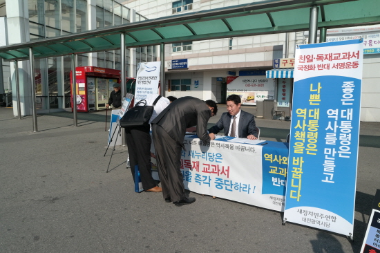 대전시당 측은 15일 오전부터 대전역을 비롯한 지역 주요 거점에서 일제히 친일·독재미화 국정 한국사 교과서 반대 서명 및 1인 시위를 전개했다.