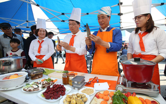 ▲ 한현택 동구청장은 ‘문어 한 마리 꽃게찜’, 권선택 대전시장은 ‘행복돼지갈비찜’의 요리를 주민과 함께 짝을 이뤄 대회에 참가해 색다른 볼거리를 제공했다.