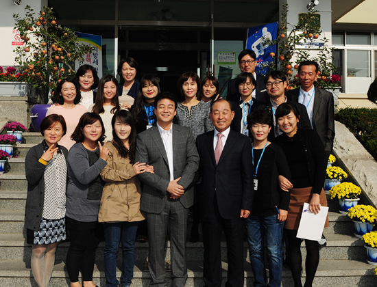 ▲ 26일 황선봉 군수와 백종원 이사장이 대화를 마치고 군청 직원들과 기념촬영을 하고 있다.