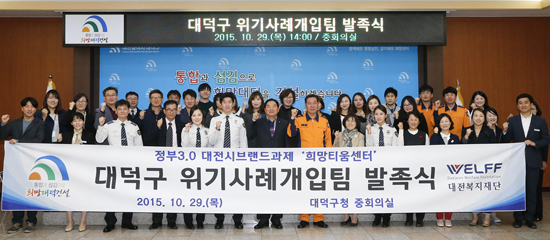위기사례에 대한 효율적이고 접근성 있는 개입을 위해 발족한 이번 대덕구 위기사례개입팀은 권역별 희망티움센터를 중심으로 대덕경찰서, 동부소방서, 대덕구정신건강증진센터, 대덕구중독관리통합지원센터, 대전카톨릭가정폭력상담소, YWCA성폭력상담소 등 전문기관이 참여했다.