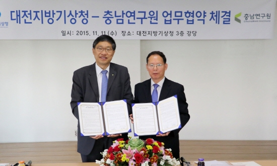 충남연구원(원장 강현수)과 대전지방기상청(청장 임용한)은 기후변화에 취약한 지역 특화산업 지원과 기후변화 대응 역량 강화 등을 위한 업무협약을 11일 체결했다.