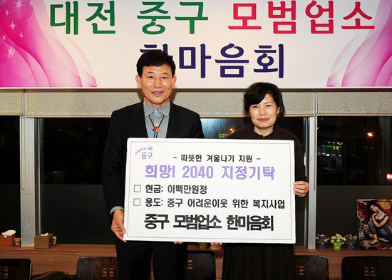 한편 지난 12일 중구 모범업소 한마음회(회장 임재희)에서는 회원 20명이 십시일반 200만원의 성금을 마련해 공동모금회를 통해 희망2040 기금에 기부하는 등 나눔문화 확산에 동참하기 위한 기금모금 행렬이 이어지고 있다.