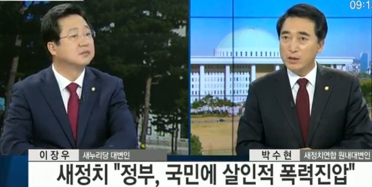 충청권 대표 의원인 새누리당 이장우 대변인과 새정치민주연합 박수현 원내대변인이 광화문 집회에 대한 책임을 놓고 공방을 벌였다.