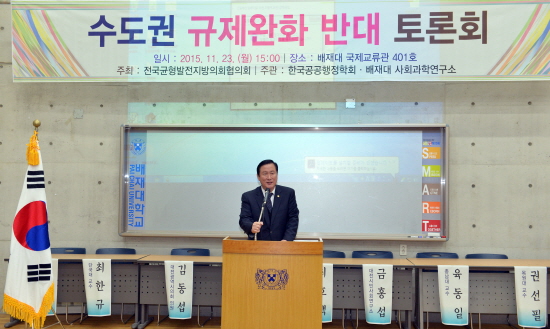 충남도의회 김기영 의장이 23일 대전 배재대 사회과학연구소에서 열린 ‘수도권규제완화 반대 토론회’에 참석해 수도권규제완화에 대한 반대 목소리를 냈다.