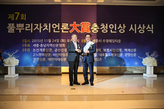 24일 세종․충남지역신문협회(회장 이평선) 주관으로 세종시 수정웨딩홀에서 열린 “2015풀뿌리자치언론 대상” 시상식에서 최시장은 일반행정 분야의 시정운영 성과에서 높이 평가받아 수상의 영예를 안았다.