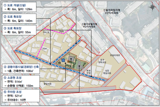 대전 동구는 이 지역에 소방도로 3개 노선 신설, 확장하고 경로당 신축, 방범용 CCTV 설치, 마을주차장 설치, 순환형 운동트랙을 갖춘 공원 조성 등 총 61억여 원의 예산을 투입하여 기반시설을 확충하고 주민 삶의 질을 향상시킬 계획이다.